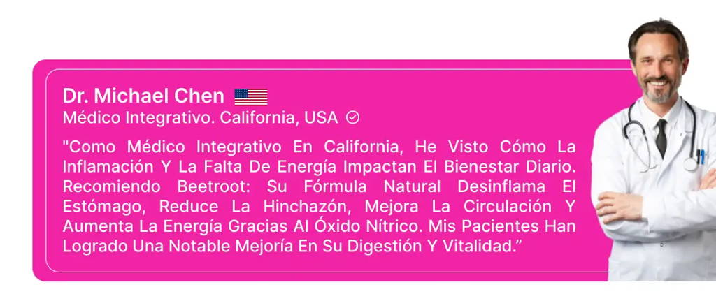 El ingrediente principal es el polvo de remolacha (Beetroot Powder), rico en nitratos naturales que tu cuerpo convierte en óxido nítrico, mejorando la circulación y la energía. Además, contiene betalaínas con potentes propiedades antioxidantes y antiinflamatorias que ayudan a desinflamar el estómago.