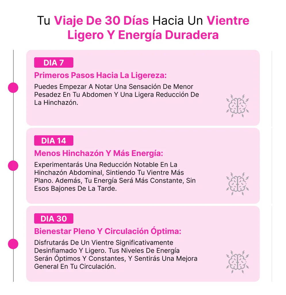 Muchos usuarios reportan sentir una ligera mejora en la digestión y energía en tan solo 7 días. Una reducción notable de la hinchazón suele observarse alrededor del día 14, y los beneficios completos de bienestar y vitalidad se consolidan en 30 días de uso constante.