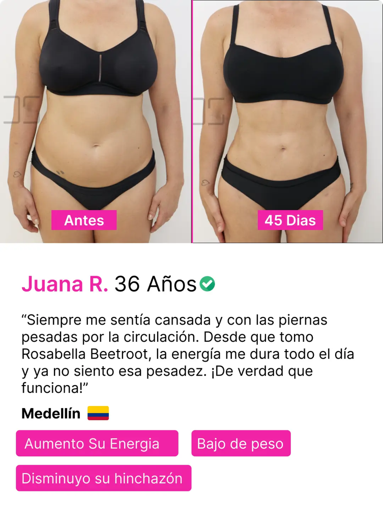 Experimenta una verdadera ligereza y energía renovada cada día. Rosabella - Beetroot desinflama tu estómago, elimina la hinchazón no deseada y potencia tu vitalidad y circulación de forma 100% natural.